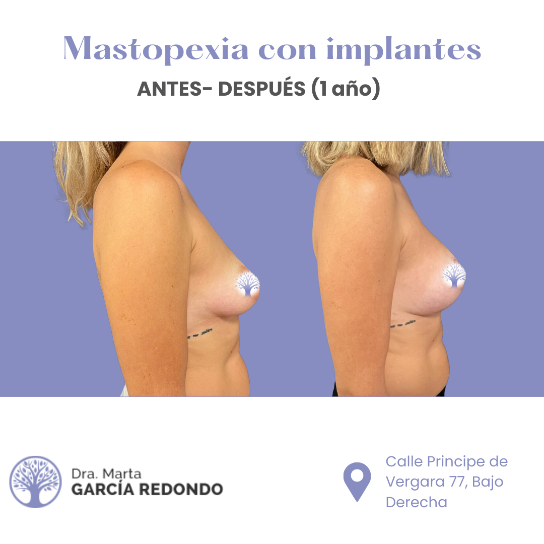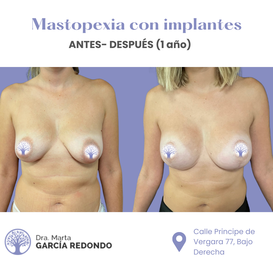Descubre imágenes reales del antes y después de nuestras pacientes que han elegido una mastopexia con implantes para mejorar la forma y posición de sus mamas. Este procedimiento combina el levantamiento de senos con la colocación de implantes, proporcionando un resultado más firme, rejuvenecido y con mayor volumen, adaptado a las proporciones de cada paciente. Si buscas recuperar la confianza y realzar tu figura con resultados naturales y personalizados, nuestro equipo experto estará a tu lado para asesorarte y garantizar el éxito de tu tratamiento. Tu satisfacción y bienestar son nuestra máxima prioridad.
